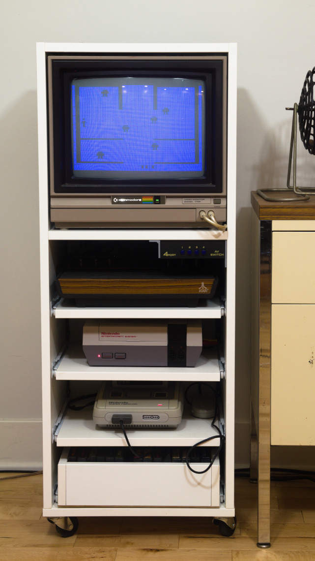 I kept my old Commodore 1702 CRT monitor and based the side of the cart around it. For the sound to escape out of the monitor's top-mounte speaker I drilled out the hole pattern from a Dieter Rams' designed transitor radio. I included 3 pull-out shelves, one for each of my favourite consoles. My heavy 6-switch Atari 2600 (if you know, you know), my original childhood NES and a japanese Super Famicom that Melissa and I picked up in Los Angeles. Each system's video output is connected to an A/V switch so no cords need changing going between the different consoles. The cart sits on wheels so it can easily be moved around. After building this, I kept the games I enjoyed and sold all of the ones I didn't. It's fun to play occasionally and I still do want to beat Startropics, but playing these games isn't nearly as fun as combing through resale stores and garage sales looking for them in the first place.